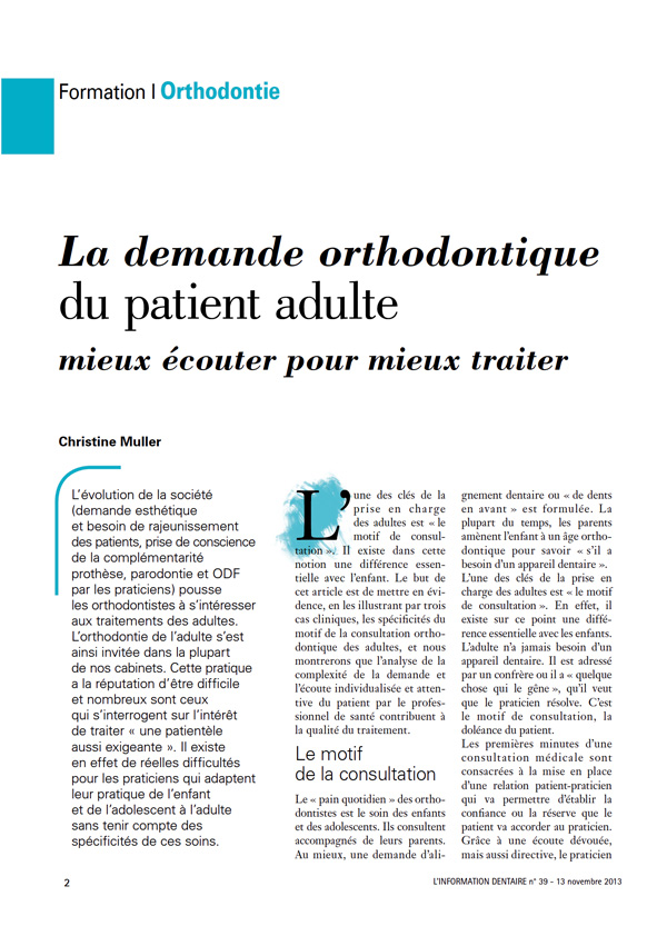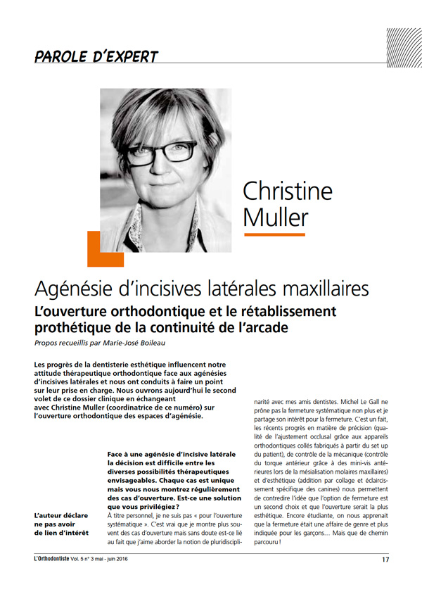Orthodontiste diplômée en 1994, le Dr Muller s’est spécialisée dans le traitement de l’adulte. Elle a développé durant toutes ces années une approche « sur-mesure » répondant aux problématiques particulières des adultes et des seniors. Dans cette perspective, elle utilise des appareils linguaux (collés sur les dents du côté de la langue et non des joues). Le Dr Muller est d’ailleurs l’un des rares praticiens à ne recevoir que des adultes. Cette posture est inédite dans la mesure où les orthodontistes sont formés à utiliser des outils conçus pour les enfants et les adolescents.