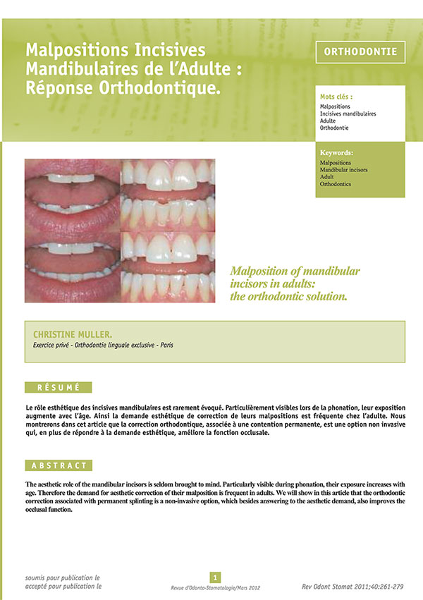 Prix du meilleur article de l’année de la revue d’odontologie-stomatologie – Malpositions incisives mandibulaires de l’adulte : réponse orthodontique